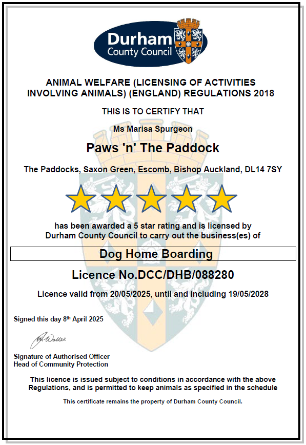 ***** Following our licence renewal inspection in April 2025 by Durham County Council, Paws n the Paddock is thrilled to announce that we have once again retained the highest possible rating – 5 stars!! *****